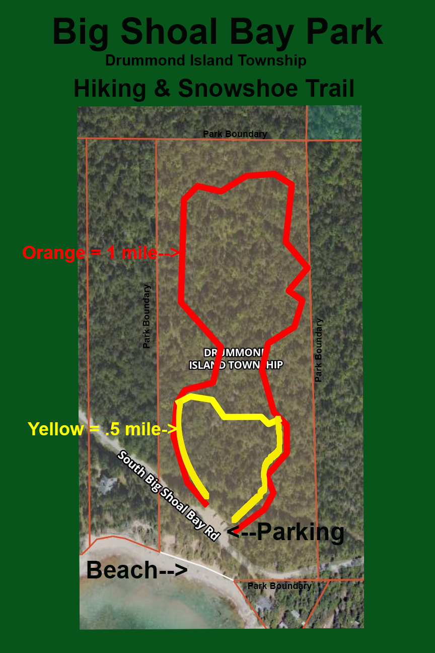 The Big Shoal Bay Trail on Drummond Island starts at the Big Shoal Beach parking area, where you’ll find easy access to the forest and a vault toilet. This peaceful trail offers a choice of a 0.5-mile loop or a 1-mile loop, winding through a lush, meditative woodland. It’s perfect for a short walk, bird watching, or a quiet snowshoe outing in winter. Along the trail, keep an eye out for hidden forest treasures and local wildlife. Trail use is free.